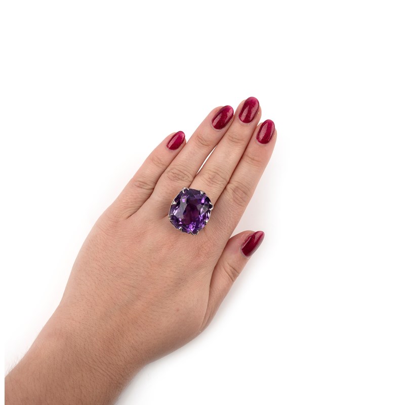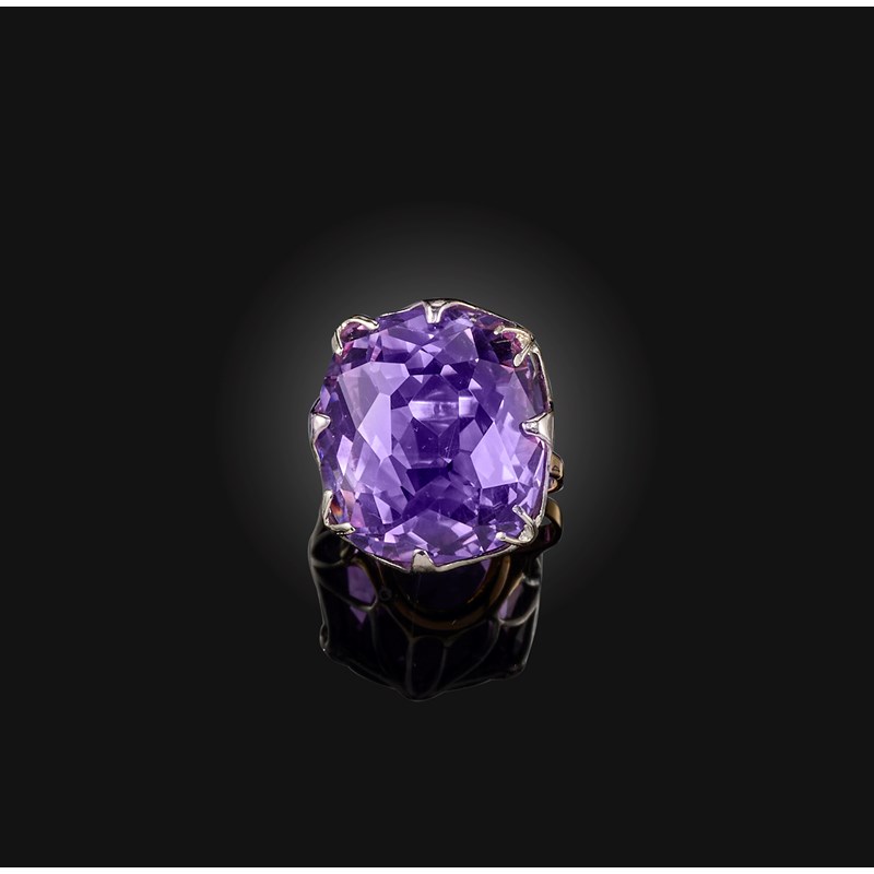 An amethyst solitaire ring, the large cushion-shaped amethyst claw-set in platinum and gold, size N