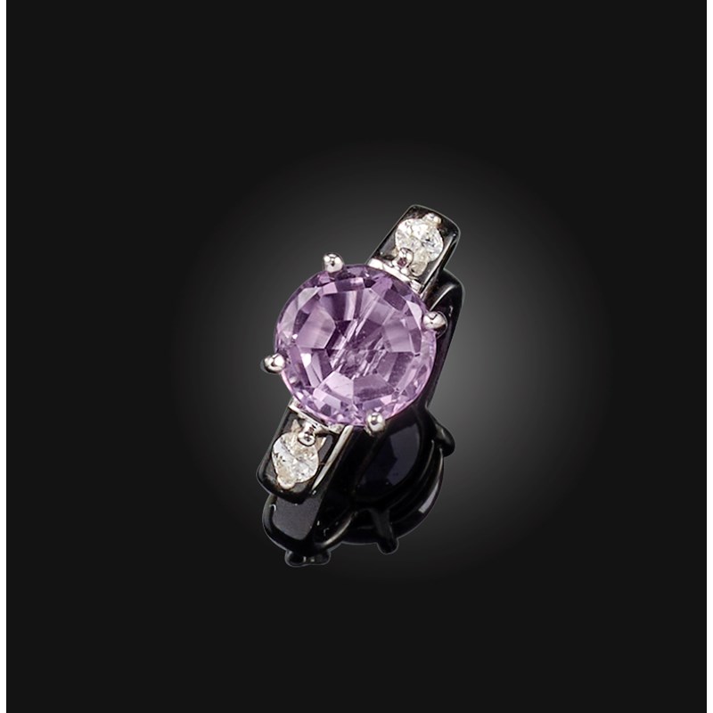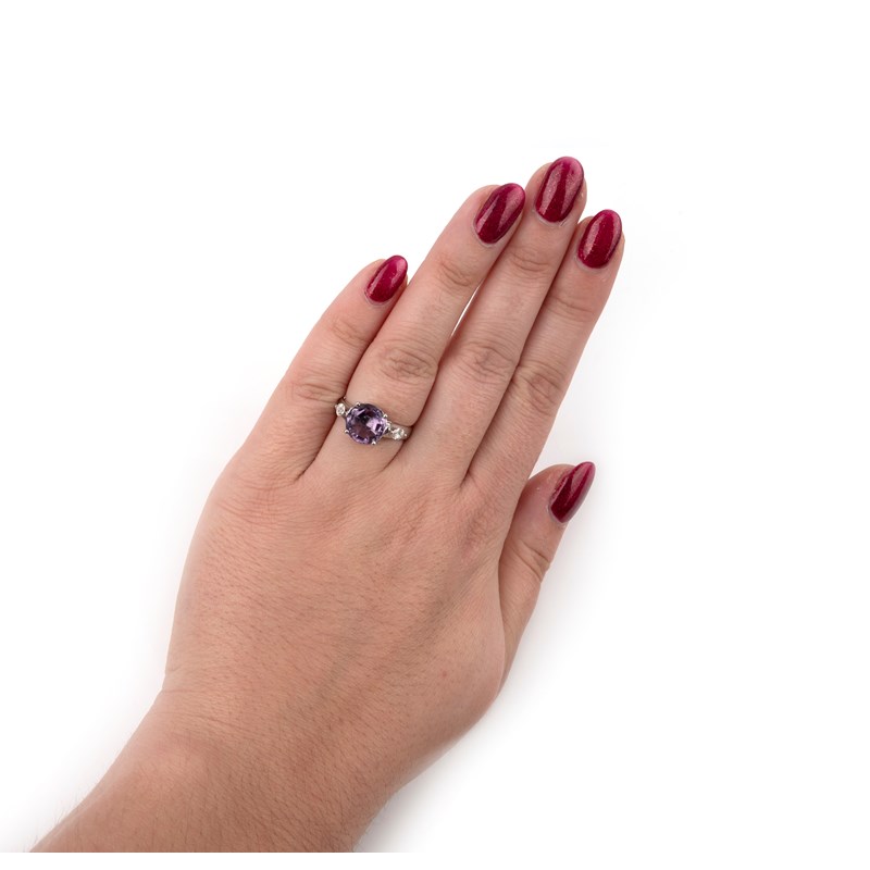 An amethyst and diamond ring, claw-set with a circular-cut amethyst, to shoulders set with