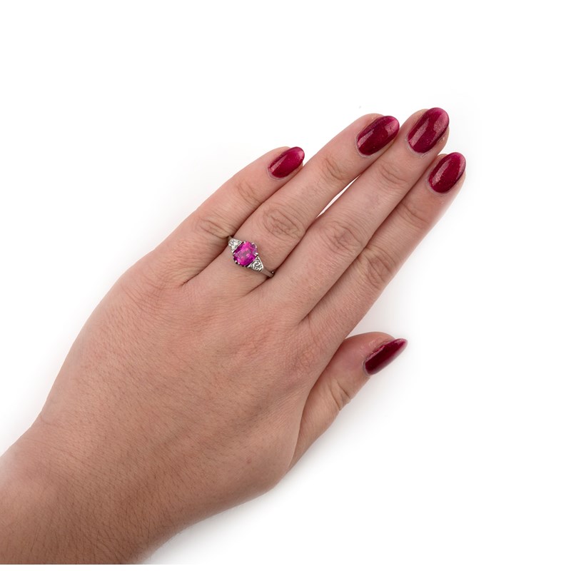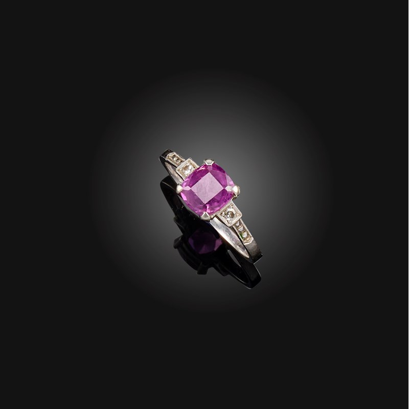 A pink sapphire and diamond ring, claw-set with a pink sapphire weighing approximately 1.10 carats, between single-cut diamonds, to a platinum band with faceted shoulders, size O1/2