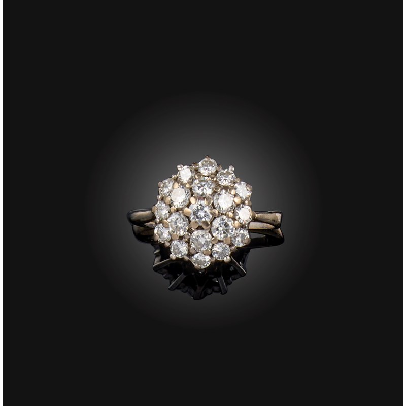 A diamond ring, of cluster design, set with brilliant-cut diamonds, mounted in white gold and