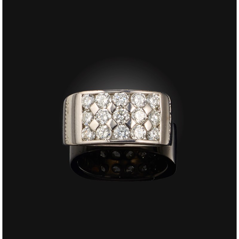 A diamond ring, the wide band set to the front with a panel of brilliant-cut diamonds, mounted in white gold, size S, stamped 750 and 18K