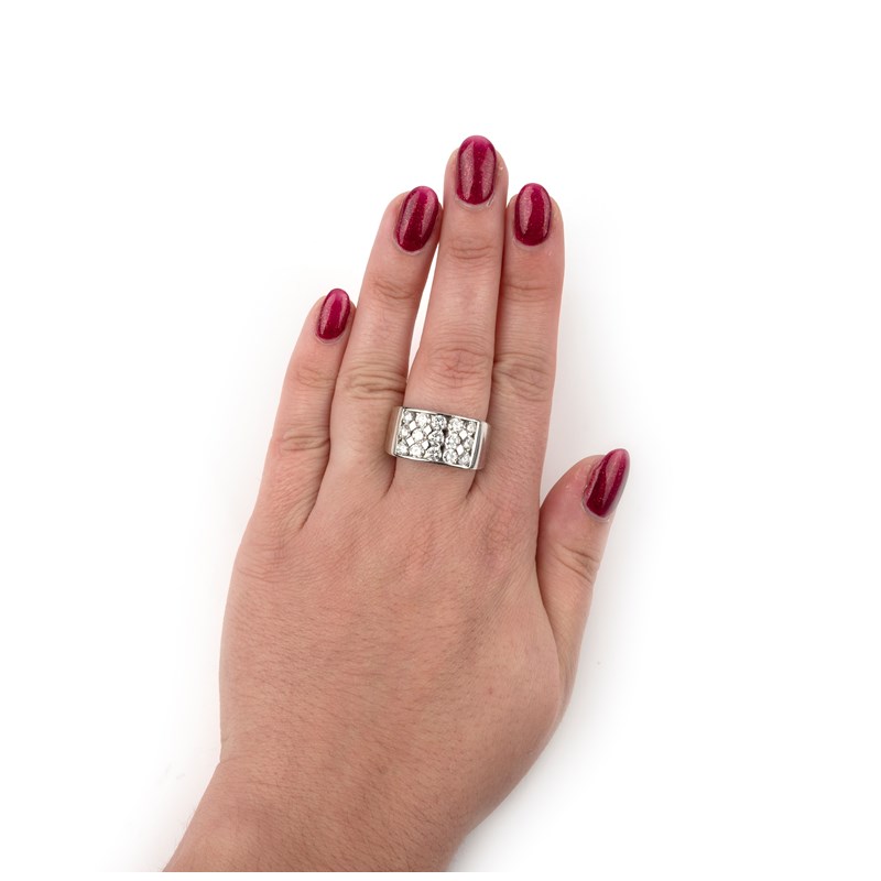 A diamond ring, the wide band set to the front with a panel of brilliant-cut diamonds, mounted in