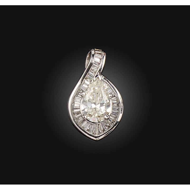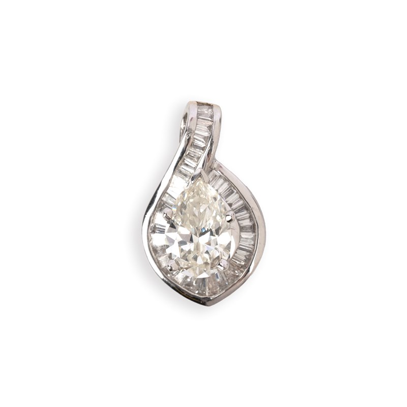 A diamond pendant, set with a pear-shaped diamond weighing 2.93 carats, within a mount channel-set with tapered baguette diamonds, mounted in white gold, length 2.5cm
