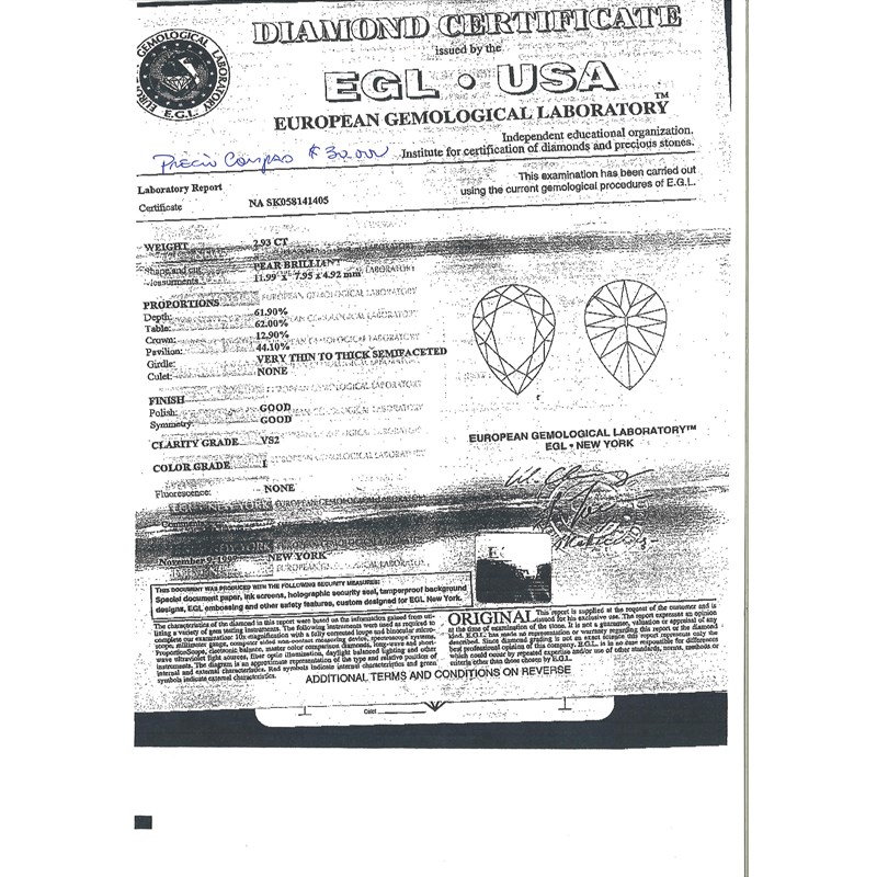 Accompanied by a facsimile of EGL report no. NA SK058141405, stating that the pear-shaped diamond is I colour, VS2 clarity, with no fluorescence