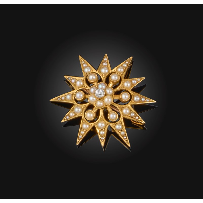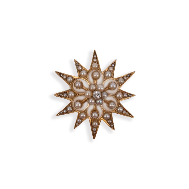 An Edwardian seed pearl and diamond brooch, early 20th century, designed as a star, set with seed pearls and a circular-cut diamond, mounted in gold, diameter 3.3cm, stamped 18CT