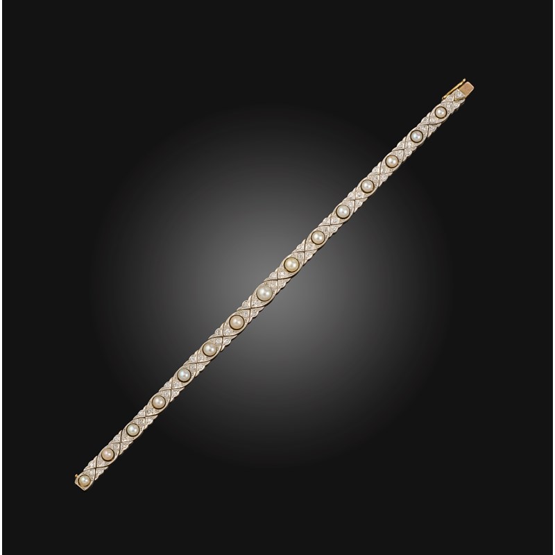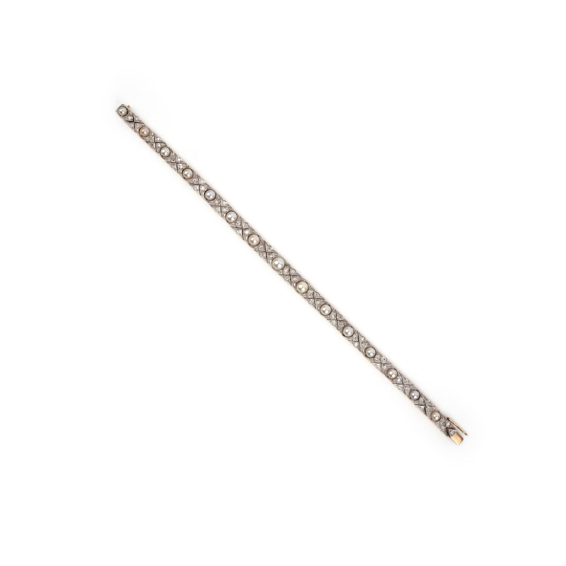 An Edwardian pearl and diamond bracelet, the bouton-shaped pearls within millegrain-set diamond