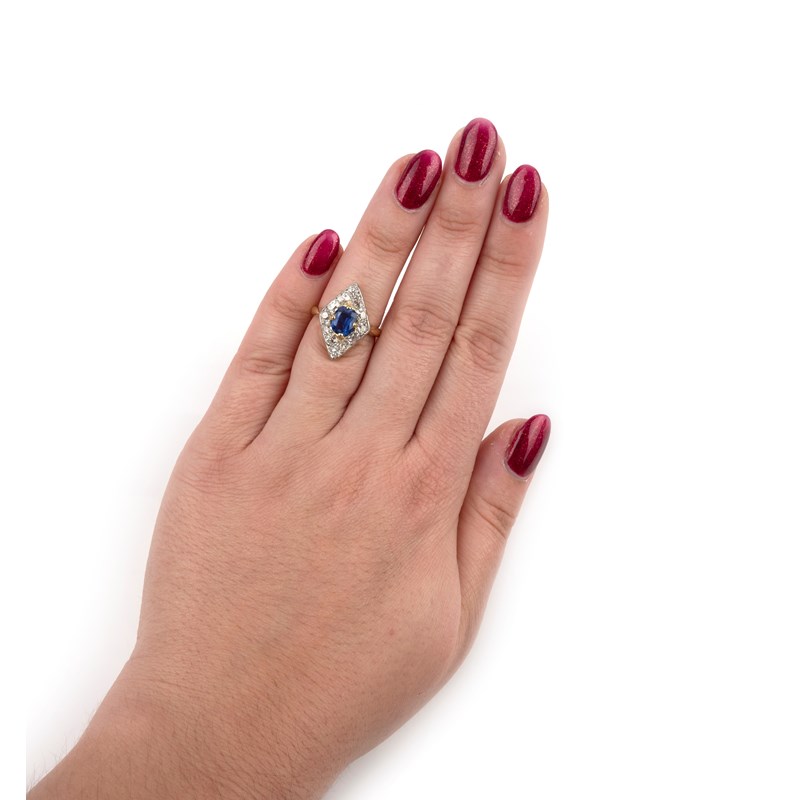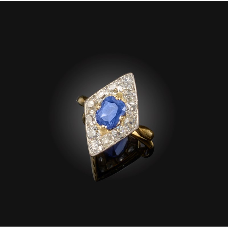 Sapphire measuring approximately 6.6 x 5.3 x 3.6mm, calculated weight approximately 0.90-1.00 carat, likely a later replacement in ring, pretty, slightly violet blue, good clarity, good condition. Estimated total diamond weight approximately 0.60 carats. Gross weight 4 grams.