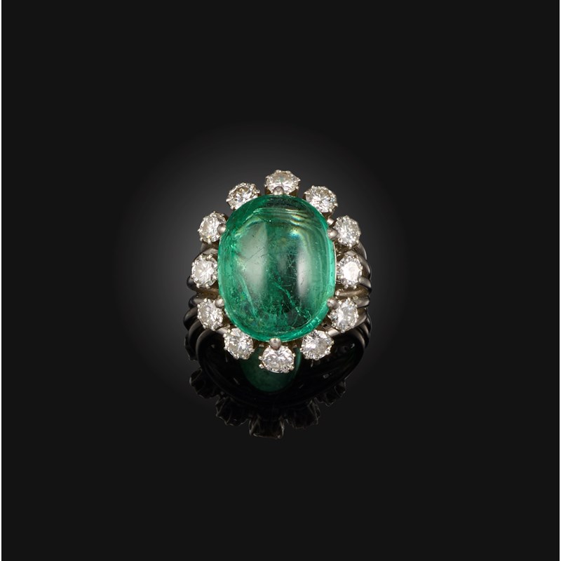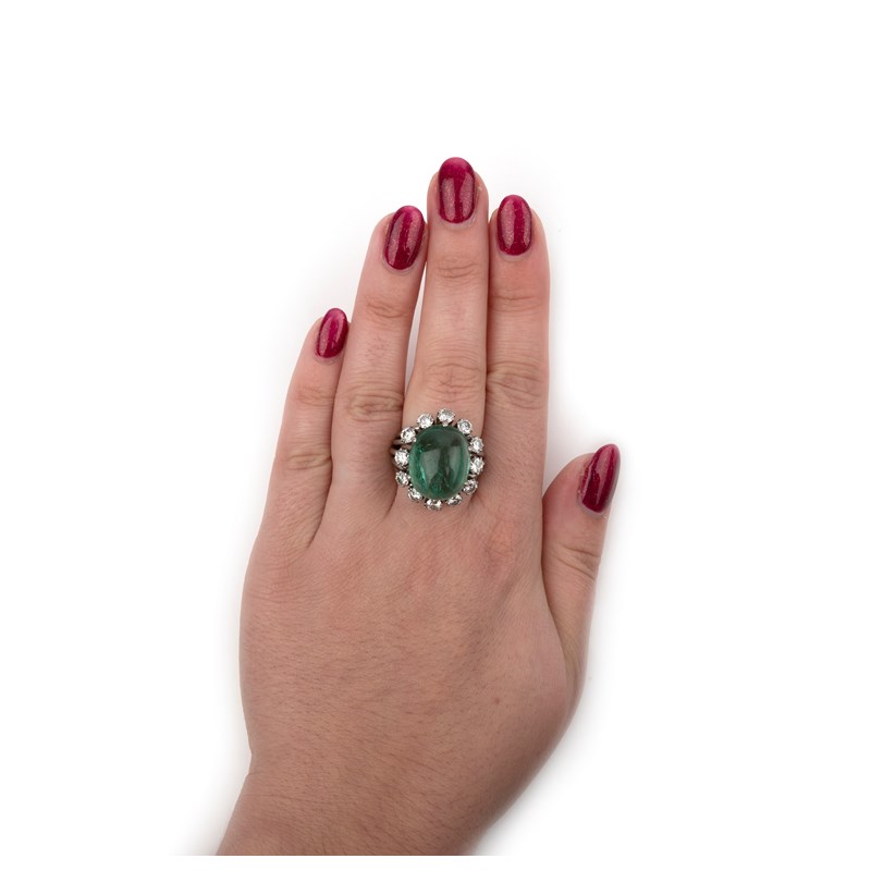 An emerald and diamond ring, of cluster design, set with a cabochon emerald within a border of