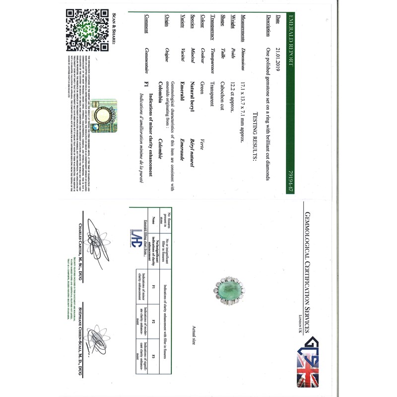 Accompanied by GCS report no. 79194-47, stating that the emerald measuring 17.1 x 13.7 x 7.1mm is of Colombian origin, with indications of minor clarity enhancement