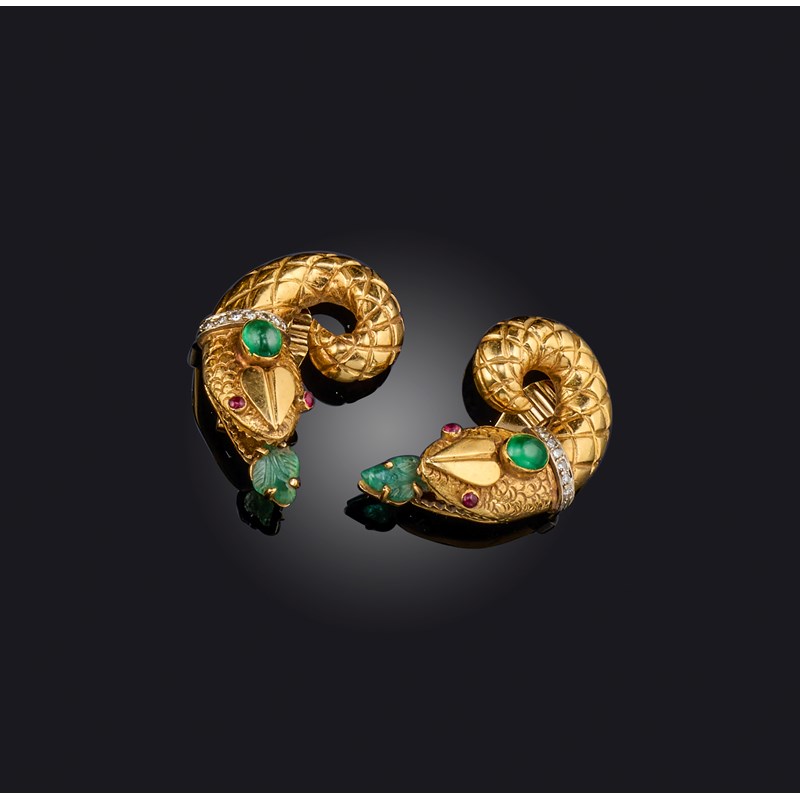 A pair of gold, emerald, ruby and diamond ear clips, each designed as a snake, set with carved and