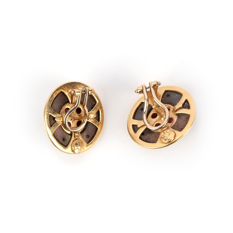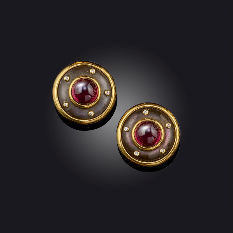 A pair of mother of pearl, rubellite and diamond earrings, each of circular outline, centring on a rubellite cabochon, within a surround of polished mother of pearl accented with brilliant-cut diamonds, mounted in 18ct gold, diameter 2.4cm each, clip and post fittings, British hallmarks for 18ct gold