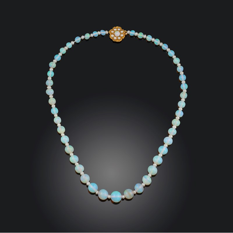 A single row opal bead necklace, the graduated white opals separated with cultured seed pearls, with