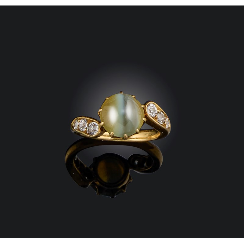 A cat's eye chrysoberyl and diamond ring, late 19th century, set with a cabochon cat's eye