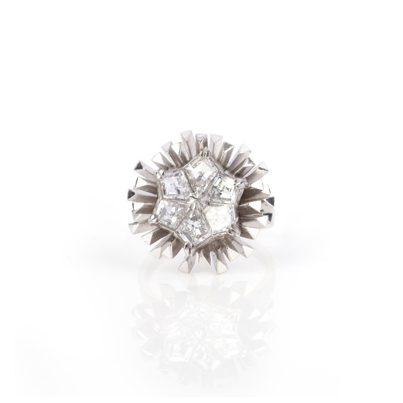 Φ John Donald, a diamond ring, circa 1965, centring on a star motif set with six kite-shaped diamonds, within an abstract radiating mount in 18ct white gold, size M, British hallmarks, sponsor's mark JAD, date letter for 1965, original case stamped John Donald