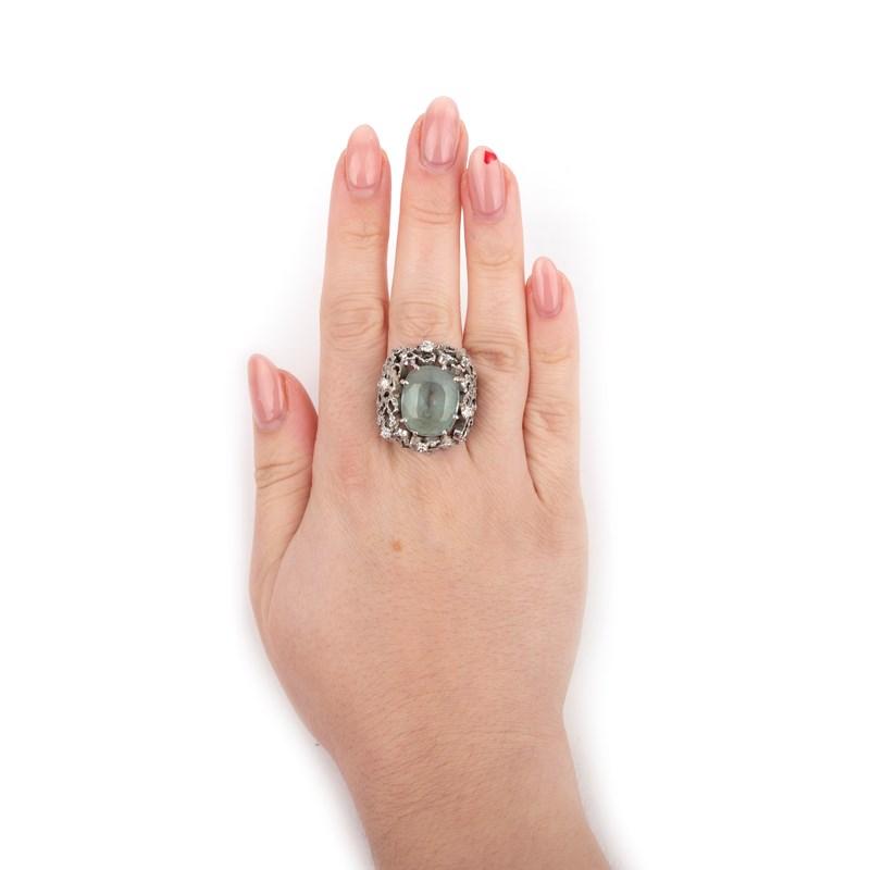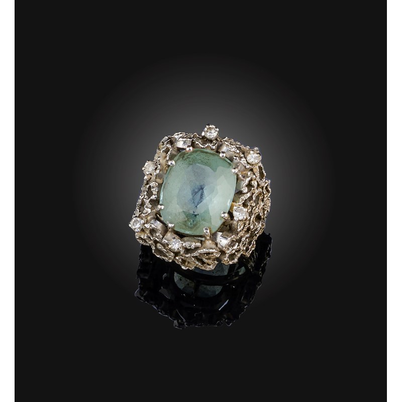An aquamarine & diamond ring, 1970s, set with a cushion-shaped aquamarine, within an abstract