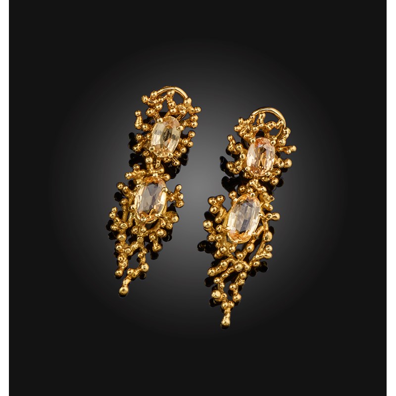 A pair of topaz and gold drop earrings, of stylised design set with graduated oval-shaped topaz within pellet-work abstract border in 18ct yellow gold, London import marks for 1977, clip fittings, length 4.5cm