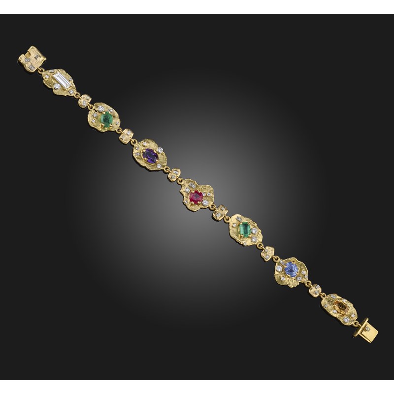 A multi-gem and diamond acrostic bracelet, 1970s, designed as a series of textured abstract gold