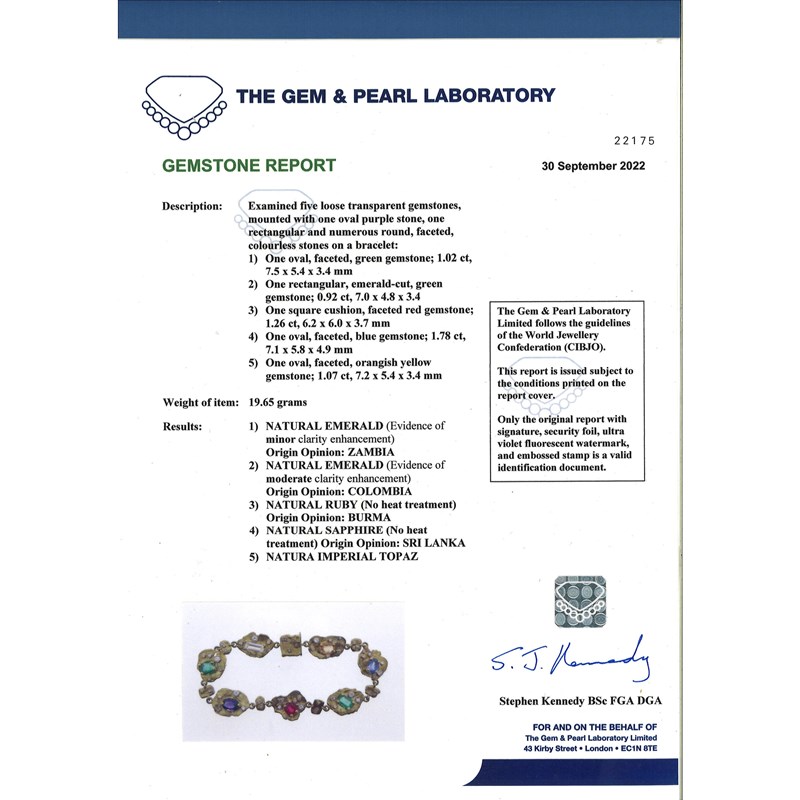 Accompanied by report no. 22175 from the Gem & Pearl Laboratory, stating that the ruby weighing approximately 1.26 carats is of Burmese (Myanmar) origin, with no indications of heat treatment, the sapphire weighing approximately 1.78 carats is of Sri Lankan origin, also with no indications of heat treatment, the oval emerald is of Zambian origin with minor clarity enhancement, the step-cut emerald is of Colombian origin with indications of moderate clarity enhancement, and the topaz is natural 'Imperial' topaz