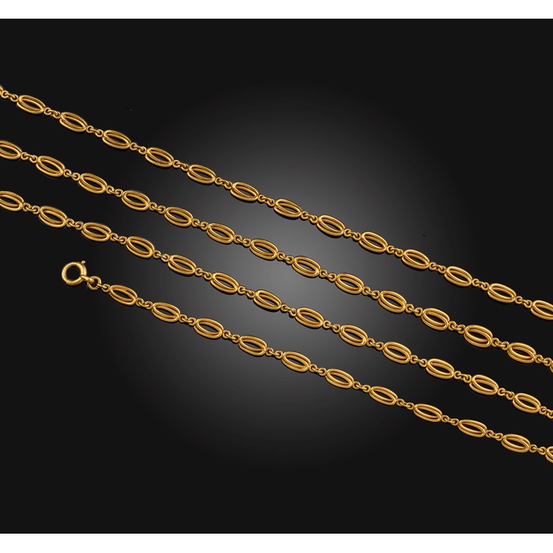 A gold longchain, France, late 19th century, composed of interlocking oval links in gold wire,