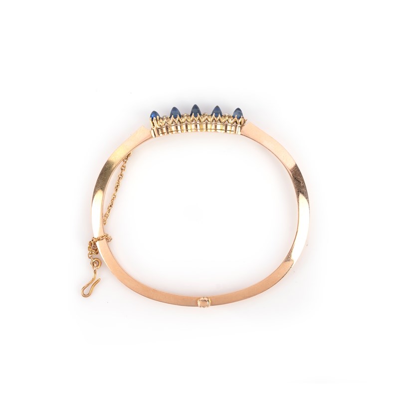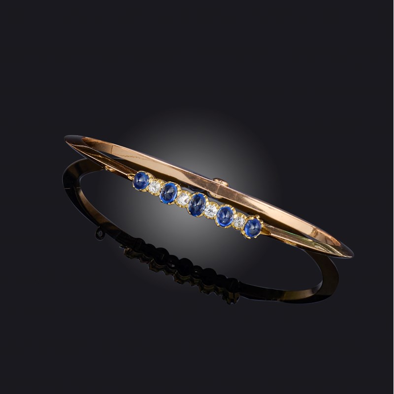 A sapphire and diamond bangle, early 20th century, centring on a line of five cabochon sapphires