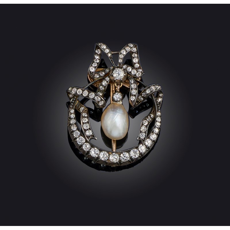 A late 19th century natural pearl and diamond brooch, centring on a drop-shaped pearl within a