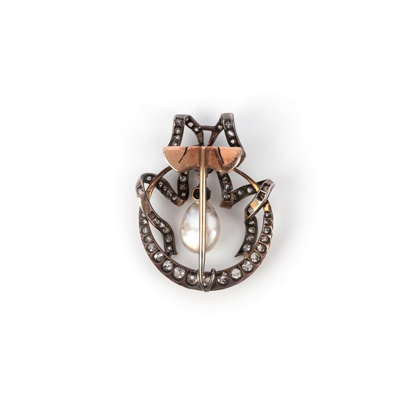 A late 19th century natural pearl and diamond brooch, centring on a drop-shaped pearl within a diamond crescent and bow surround, set in silver and gold, later brooch fitting, length 3.8cm
