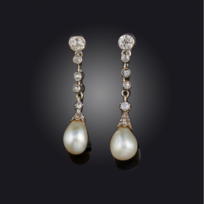 A pair of natural pearl and diamond drop earrings, set with articulated lines of cushion-shaped