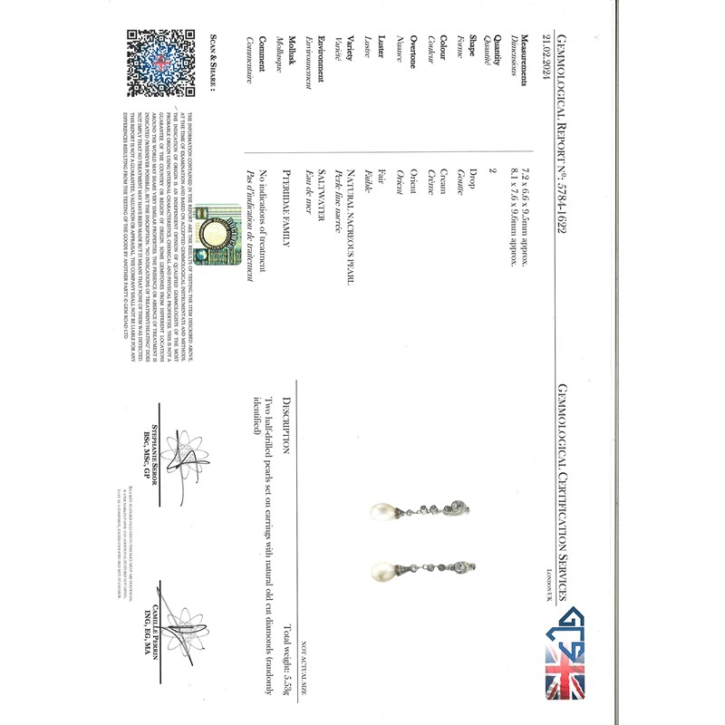 Accompanied by GCS report no. 5784-1622, dated 21st February 2024, stating that the two cream drop pearls measuring approximately 7.2 x 6.6 x 9.5mm and 8.1 x 7.6 x 9.6mm are natural, saltwater