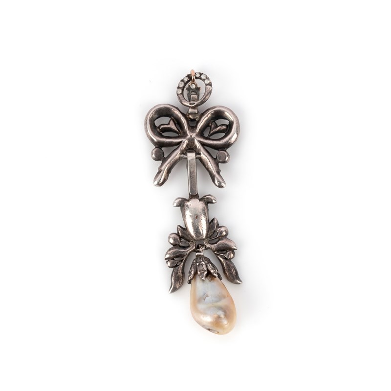 A natural pearl and diamond pendant, 18th century, designed as a ribbon bow suspending a foliate