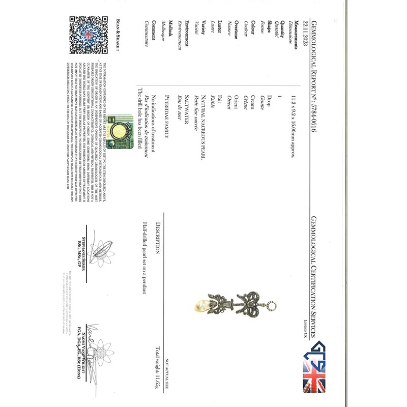 Accompanied by GCS report no. 5784-0616, stating that the pearl is natural, saltwater