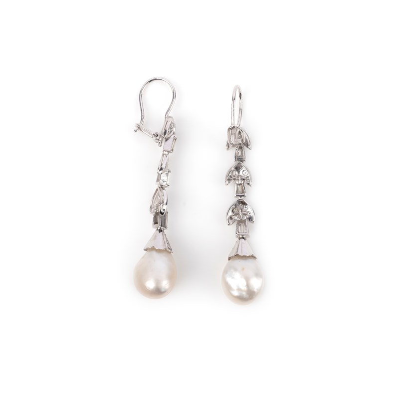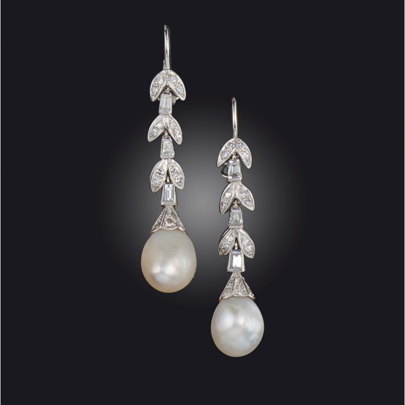 A pair of natural pearl and diamond earrings, each of pendent design, composed of foliate links set with single-cut and baguette diamonds, suspending a natural pearl, mounted in platinum, length 5.1cm, hook fittings