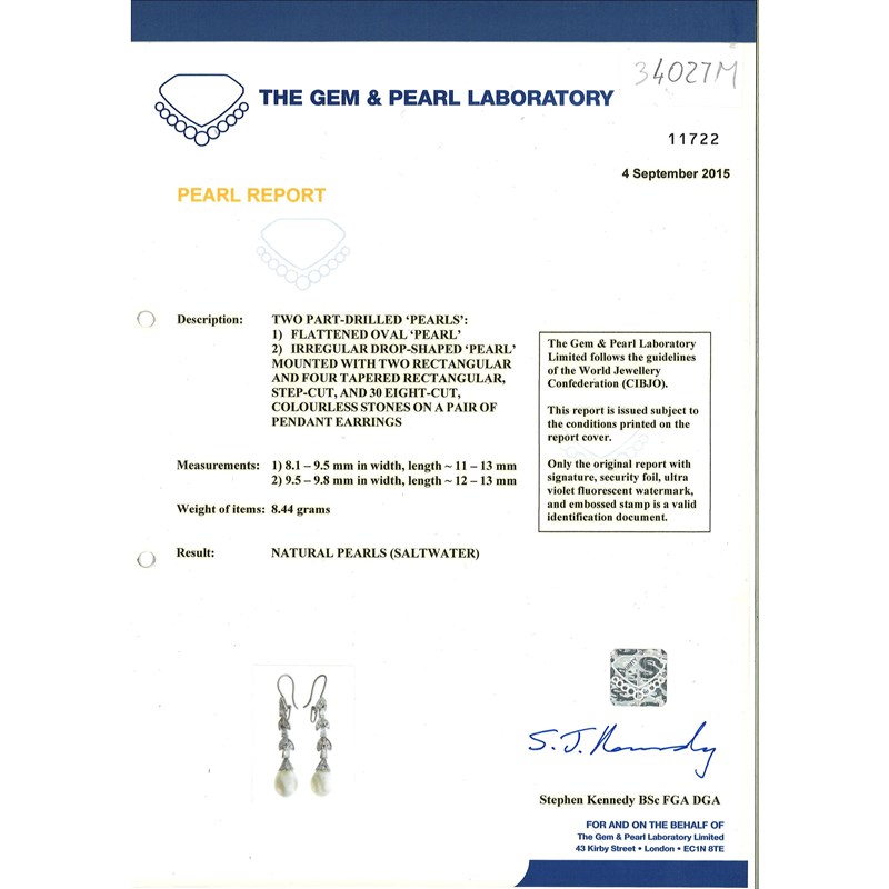 Accompanied by report no. 11722 from the Gem and Pearl Laboratory, stating that the pearls measuring approximately 8.1-9.5 x 11-13mm and 9.5-9.8mm x 12-13mm respectively are natural, saltwater