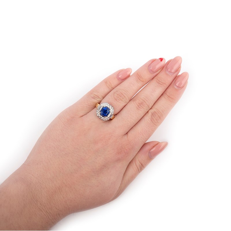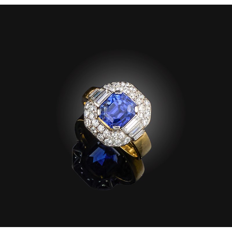 A sapphire and diamond ring, set with a step-cut sapphire measuring approximately 7.6 x 6.8 x 6.1mm, to a mount pavé-set with brilliant-cut diamonds, the shoulders set with baguette diamonds, to a gold band, size L1/2, French import assay marks for 18ct gold and platinum
