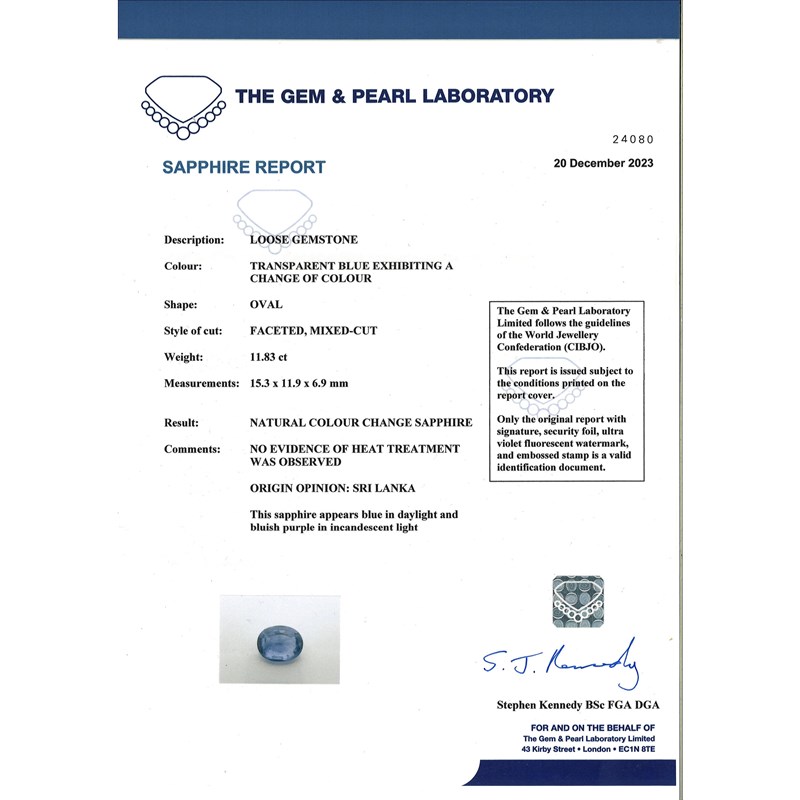 Accompanied by report number 24080 from The Gem & Pearl Laboratory, dated 20th December 2023, stating that the colour change sapphire is of Sri Lankan (Ceylon) origin, with no indications of heat treatment