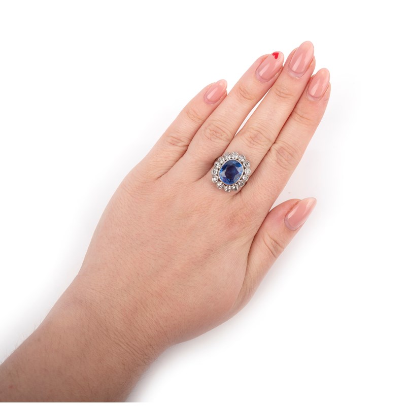 A sapphire and diamond ring, collet-set with a cushion-shaped sapphire weighing approximately 5.50 carats, within a border of circular-cut diamonds, mounted in platinum, size N1/2