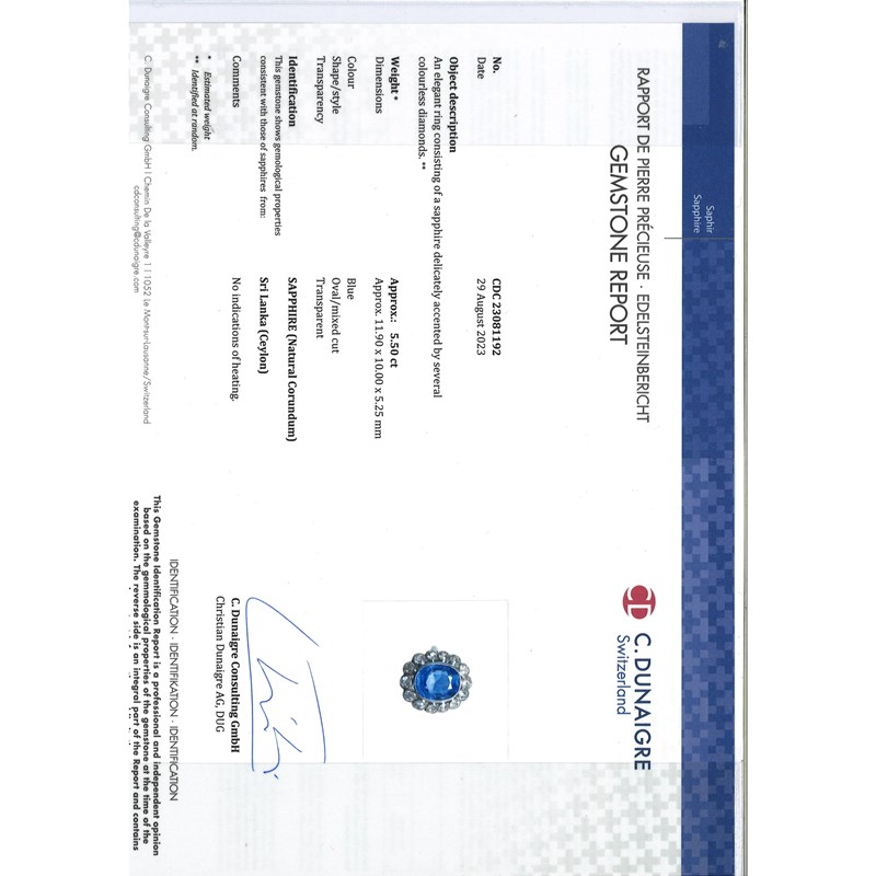 Accompanied by report no. CDC 23081192 from C.Dunaigre Switzerland, stating that the sapphire is of Sri Lankan (Ceylon) origin, with no indications of heat treatment
