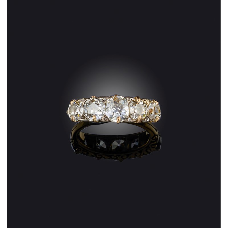 A late 19th century diamond five stone ring, set with graduated old cushion-shaped diamonds and