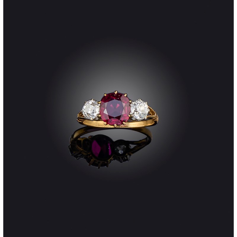 A ruby and diamond three-stone ring, late 19th century, the cushion-shaped ruby flanked by a pair of circular-cut diamonds, mounted in gold, size O