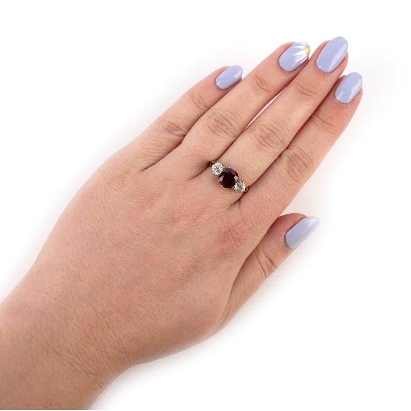 A ruby and diamond three-stone ring, late 19th century, the cushion-shaped ruby flanked by a pair of