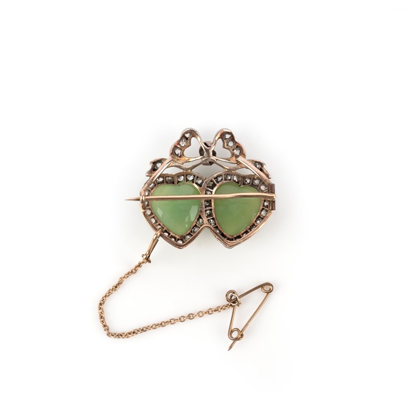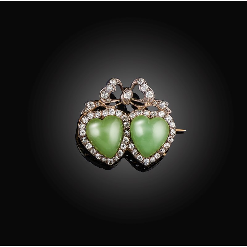 A Victorian chrysoprase and diamond brooch, late 19th century, designed as two hearts surmounted by