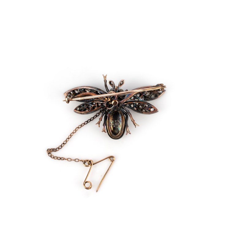 A Victorian diamond and ruby brooch, late 19th century, designed as a bee, set with cushion-shaped and rose-cut diamonds, its eyes set with cushion-shaped rubies, mounted in silver and gold, wingspan 4.1cm, one foreleg deficient