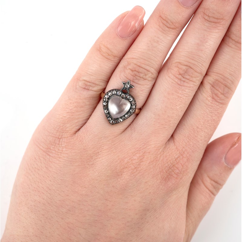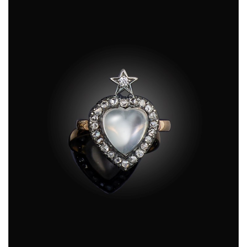 A moonstone and diamond ring, designed as a heart surmounted by a star, set with a polished heart-shaped cabochon moonstone, bordered with rose-cut diamonds, mounted in silver and gold, size M1/2