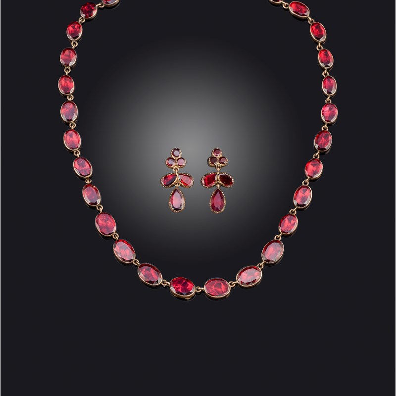 A garnet demi-parure, 19th century and later, comprising: a rivière necklace composed of flat oval