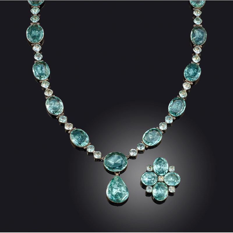 A rare 'Queen Anne' paste necklace and brooch, second half 18th century and later, comprising: a necklace, composed of oval, and cushion-shaped pastes suspending a pear-shaped pendant, in a pale blue colour imitating aquamarine, in foiled silver settings, to a later clasp set with colourless pastes, length 43cm; and a similar brooch of quatrefoil design, length 4.4cm, later brooch fittings, fitted case