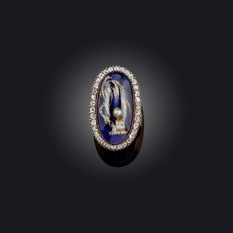λ No reserve - a superb pearl, enamel and diamond mourning ring, circa 1791, of oval outline, centring on a funerary monument composed of an ivory panel initialled ID, surmounted by a pearl, to a rose-cut diamond base, beneath a three-dimensional weeping willow set with rose-cut diamonds, on a blue enamel ground, covered by a glazed panel, to an outer border of cushion-shaped diamonds, the reverse with a glazed compartment containing hairwork, bordered by the dedicatory inscription 'Ja.s Duberly Esq died 4 July 1791 Aged 64', mounted in silver and gold, size Q1/2, front measuring 3.5 x 2.1cm, pearl untested