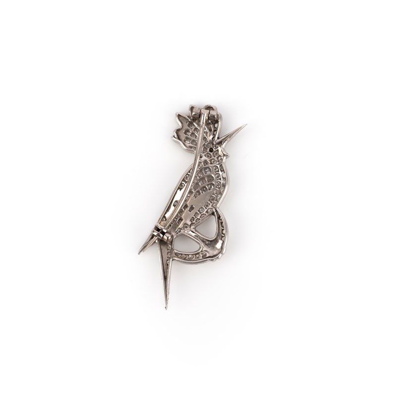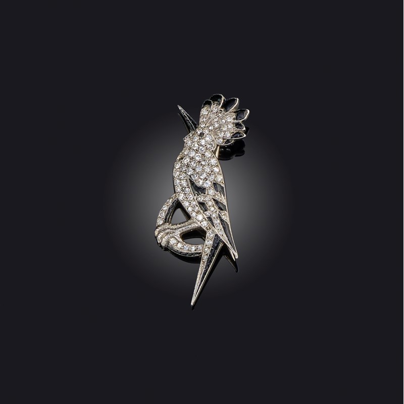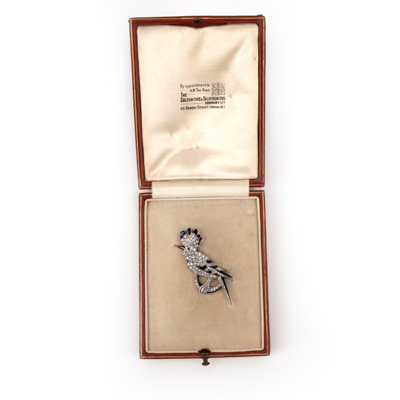 An unusual Art Deco enamel and diamond brooch, 1920s, designed as a hoopoe on a curved branch, set with single-cut diamonds and applied with black enamel, mounted in platinum, length 4.3cm, one diamond deficient, fitted case stamped Goldsmiths & Silversmiths Company