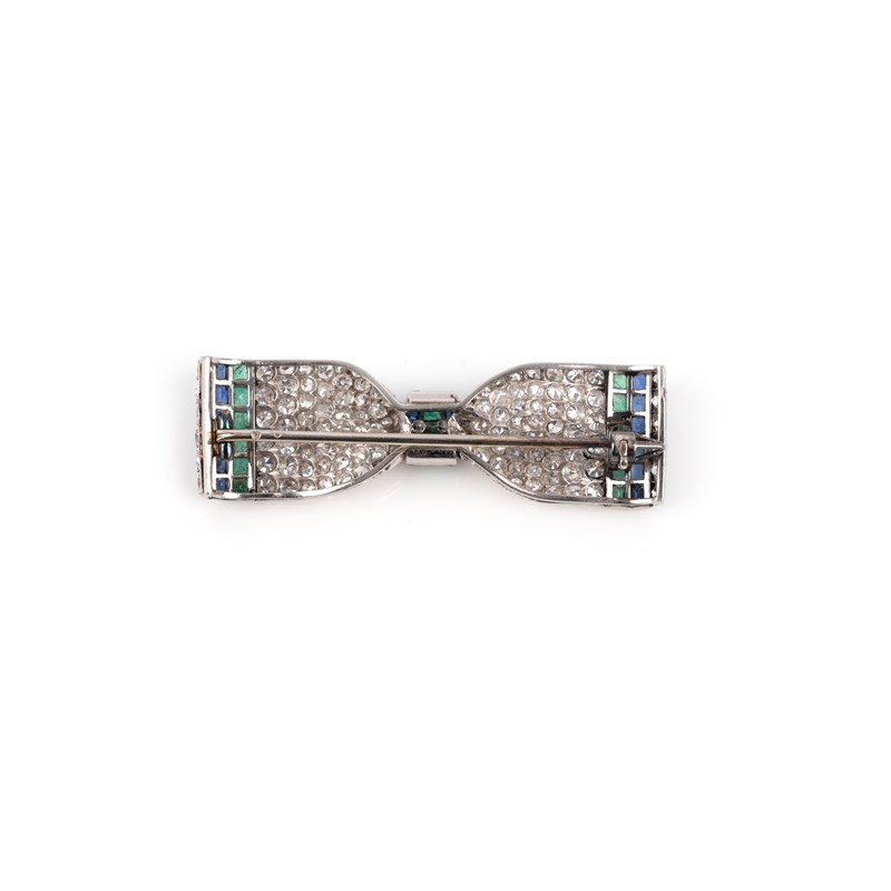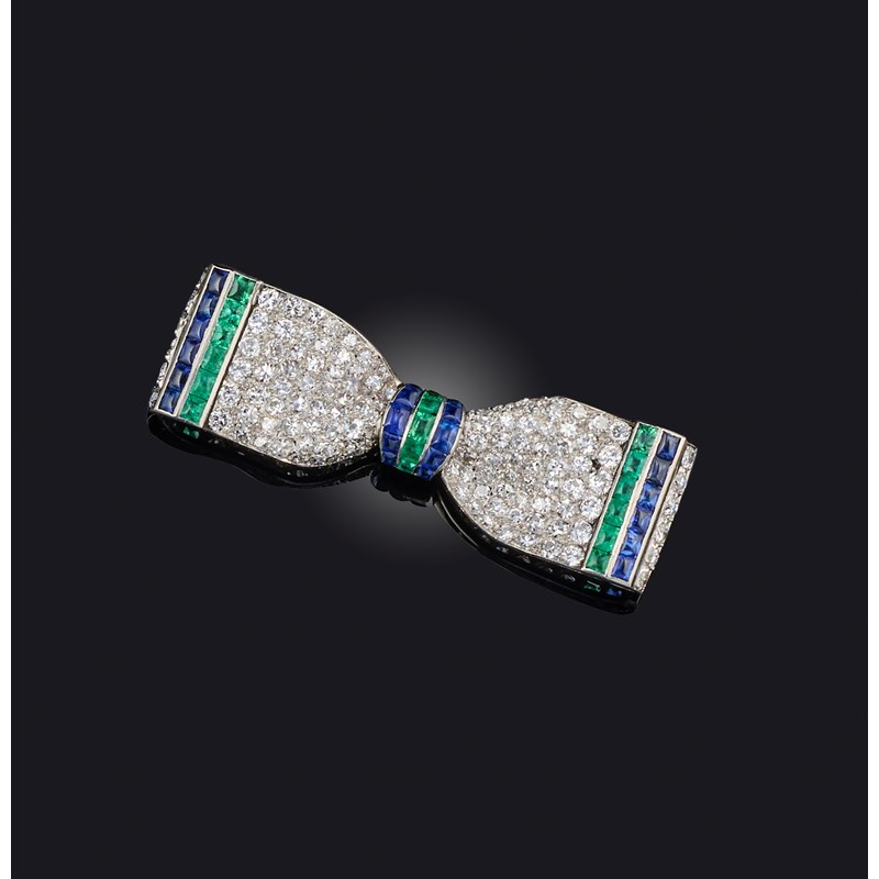 Henri Picq, an Art Deco emerald, sapphire and diamond brooch, 1920s, naturalistically modelled as a ribbon bow, pavé-set with circular-cut diamonds, accented with lines of buff-topped calibré-cut emeralds and sapphires, mounted in platinum, length 4.9cm, French assay marks for platinum and 18ct gold, partial maker's mark HP with ace of spades for Henri Picq, numbered 88114