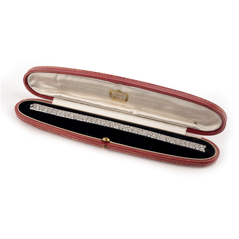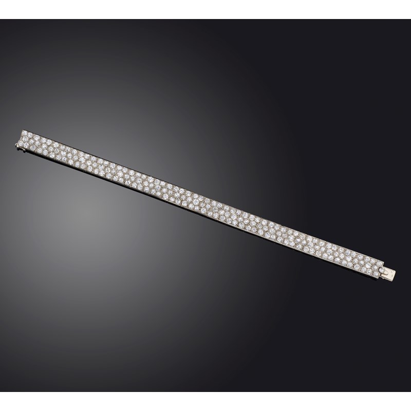 Henri Lavabre, a fine Art Deco diamond bracelet, 1920s, designed as an articulated ribbon, pavé-set with circular-cut diamonds, length 18cm, maker's mark HL with flower for Henri Lavabre, numbered LV432, case stamped Cartier, numbered to the interior CL432