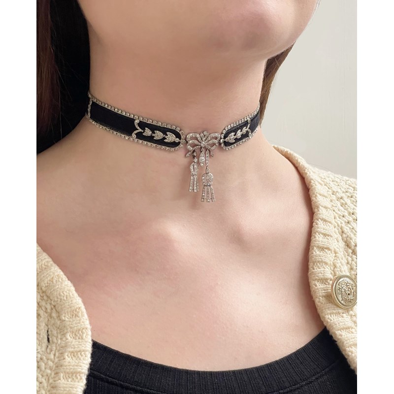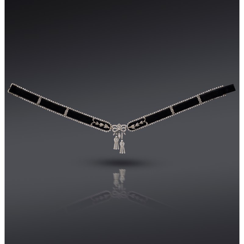 Attributed to Cartier, a fine Belle Epoque diamond choker necklace, circa 1907, centring on a ribbon bow suspending two tassels and a navette-shaped pendant, set with circular-cut and rose-cut diamonds, to a black velvet choker necklace bordered with rose-cut diamonds, mounted in millegrained platinum, length of necklace 30.5cm, length of central pendant 4.0cm, unsigned, clasp with French maker's mark GS with a spouted jug for Guillaume Saibène, stamped MD for 'Metaux Divers'