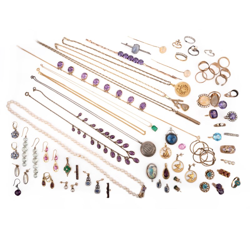 A large collection of jewels, comprising: an opal and diamond ring and pair of opal pendants; an opal and diamond pendant on a gold chain, stamped 375; a zodiac pendant for Scorpio, stamped 750, chain stamped 375; a synthetic colour-change sapphire necklace in gold, stamped 585; three rings and a bracelet set with synthetic colour-change sapphires; two pairs of sapphire and paste earrings; a pair of sapphire and diamond cluster earrings; a 9ct gold 'screw you' ring with a screw and letter U, British hallmarks; two gold pendants and a pair of stud earrings set with green pastes; a pair of faceted aquamarine earrings; a 9ct gold propelling pencil on a chain, British hallmarks; a Victorian turquoise and diamond ring; a chalcedony bar brooch; a synthetic goldstone ring mounted in gold; a skeletonised coin demi-parure; a cultured pearl necklace; a three silver pendants; a loose paste; three paste earrings; two garnet links; a ring mount; two amethyst rings; one earring and a necklace and pendant set with purple pastes; three cultured pearl rings, one stamped 9ct; a blue topaz ring in 9ct gold, British hallmark; seven gold rings including a 9ct gold puzzle ring, British hallmark; a mother of pearl ring in 9ct gold, British hallmark; two rings set with simulant diamonds, one with British hallmark for 18ct gold; three diamond rings in gold, one with British hallmarks; a pair of mother of pearl earrings; a cultured pearl necklace; and a gilt metal chain